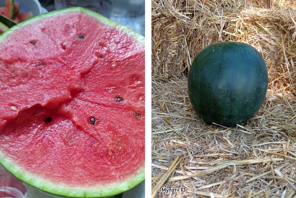 «МУЛАТ» F1 — арбуз с волшебным вкусом, вызревает в сентябре, имеет насыщенную, исключительно сладкую мякоть, с тонкой кожурой, весом 6 кг.