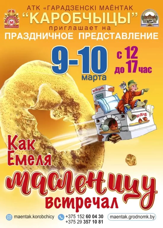 Поместье гродненского мясокомбината организует праздник 9 и 10 марта. В Коробчицах пройдет представление «Как Емеля весну встречал». Начало в 12 часов.