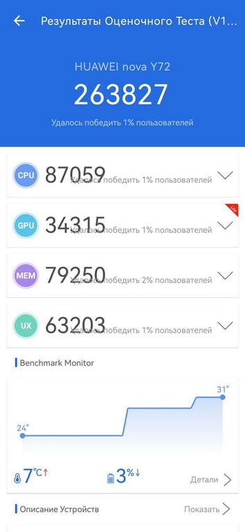 Huawei nova Y72 собран на базе весьма мощного бюджетного процессора HiSilicon Kirin 710 и 8 ГБ оперативной памяти. Эта платформа обеспечивает высокую производительность для повседневных задач и позволяет наслаждаться даже требовательными к ресурсам играми – пусть и не всегда на максимальных настройках графики. Большой объем оперативной памяти отвечает за плавную работу интерфейса в том числе при большом количестве одновременно запущенных приложений. Хорошую оценку (для данной ценовой категории) устройству дает и бенчмарк.