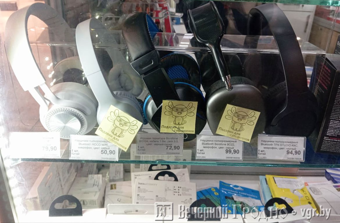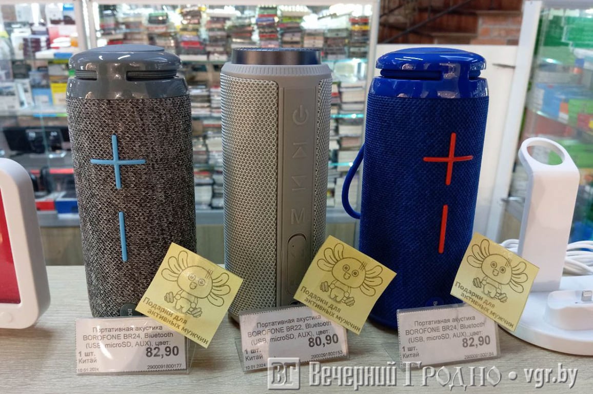 На островках также можно найти различные портативные устройства, к примеру, музыкальные колонки. Стоимость их разнится (диапазон цен в зависимости от размера и характеристик — от 54 до 98 рублей), но на 100 рублей вполне можно что-то выбрать. Еще одна идея — наушники, достойные модели обойдутся плюс-минус «соточка».