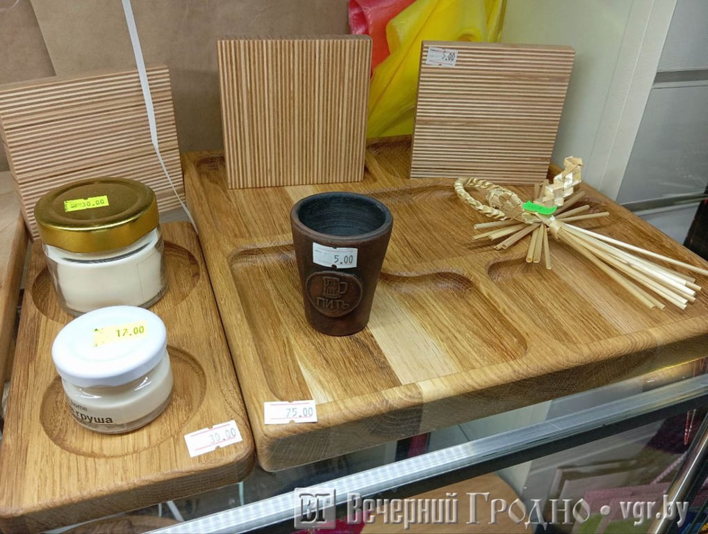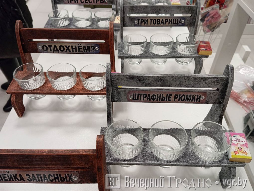 Еще одним практичным подарком может стать деревянная менажница за 75 рублей, а в дополнение к ней несколько стопок с надписью «Пить» по 5 рублей. Такой вариант найдете на втором этаже, на островке возле эскалатора.