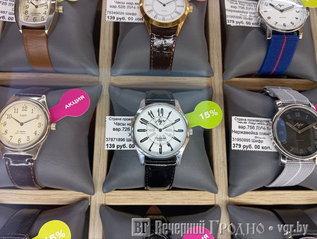 Как вариант — наручные часы, тоже белорусские. На многие модели — минус 20%, которые будут действовать по 25 февраля включительно. Некоторые часы и без скидки стоят в пределах 100 рублей.