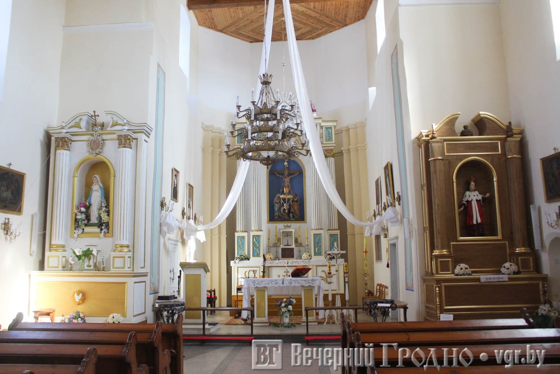Заходим на территорию костела святого Казимира, где нас встречает настоятель храма Виталий Цыбульский. Ксендз родом из Щучина, но вот уже 8 лет служит во Вселюбе. Священник признается, что здесь рады всем гостям независимо от вероисповедания. Нам предложили зайти в храм, а затем подняться по лестнице святого Казимира.