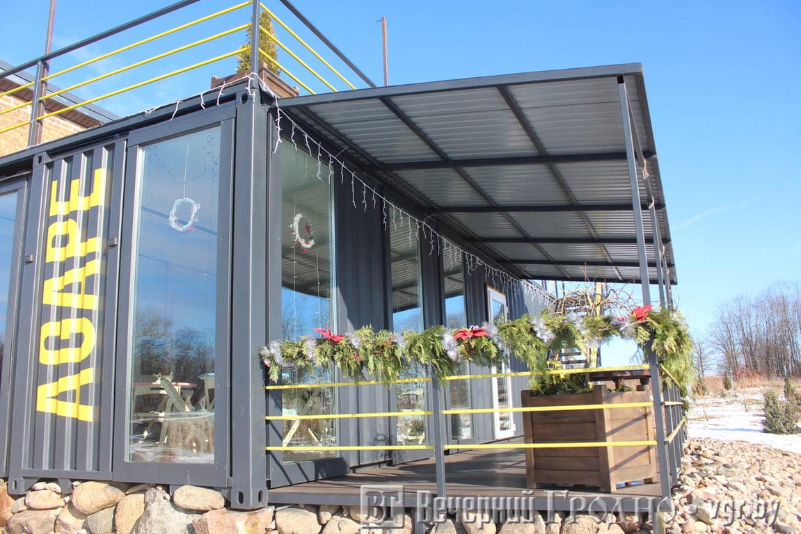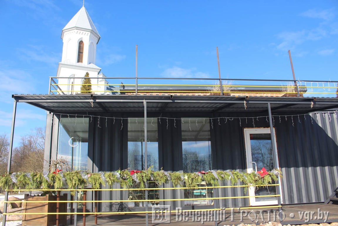 На территории костел есть еще один необычный объект. Это кафе, сделанное из морского контейнера. В теплое время года пообедать и выпить чашку кофе можно на террасе и на крыше, где тоже организовали уютную площадку. Внутри кафе на стенах висят картины волонтеров в стиле импрессионизма.