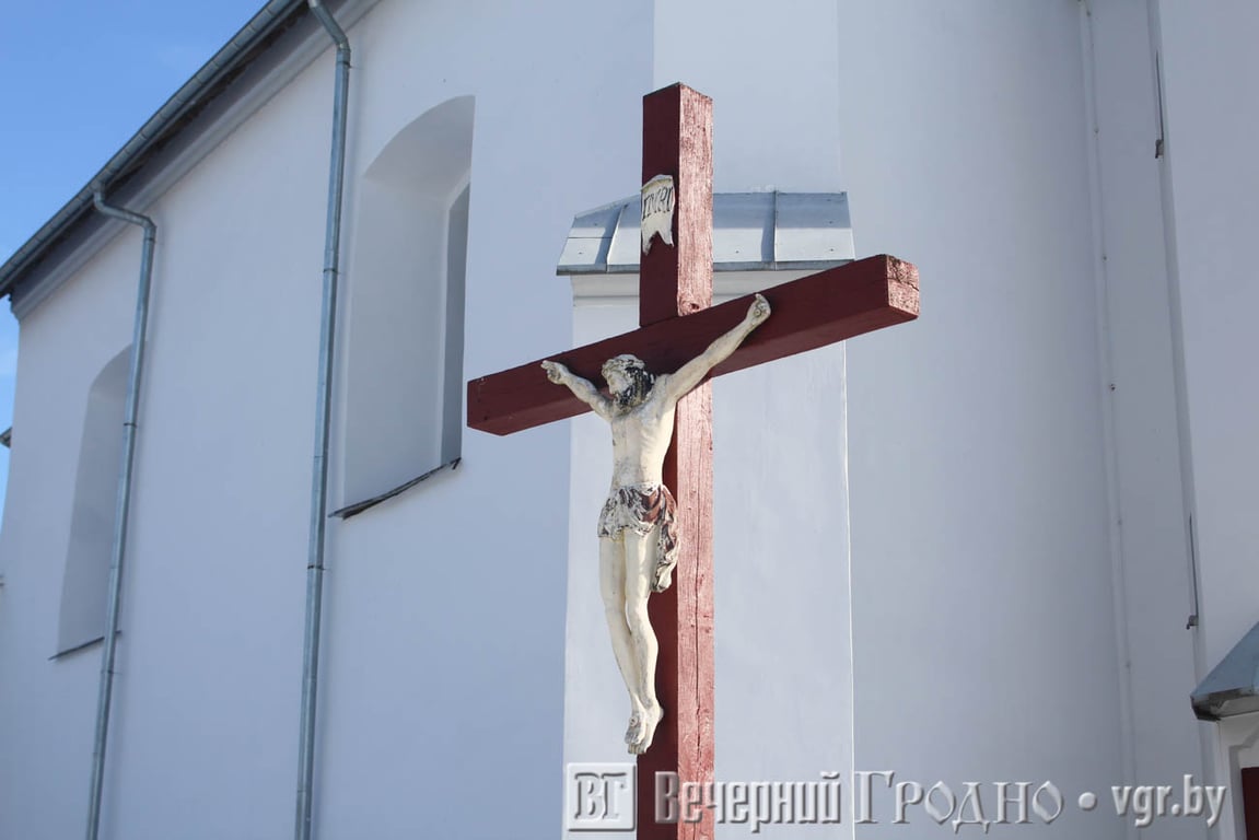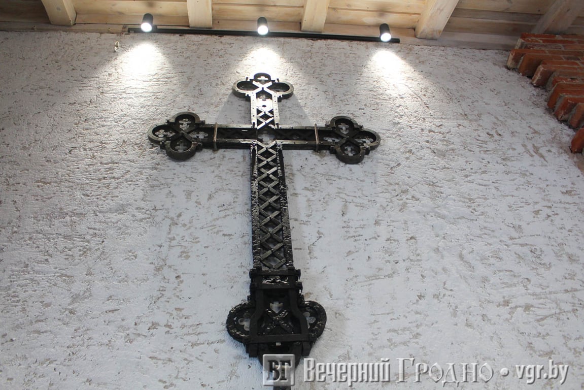 — Этот крест мы нашли в лесу. Раньше он был вмурован в ступени костела, — ксендз Виталий показывает на стену.