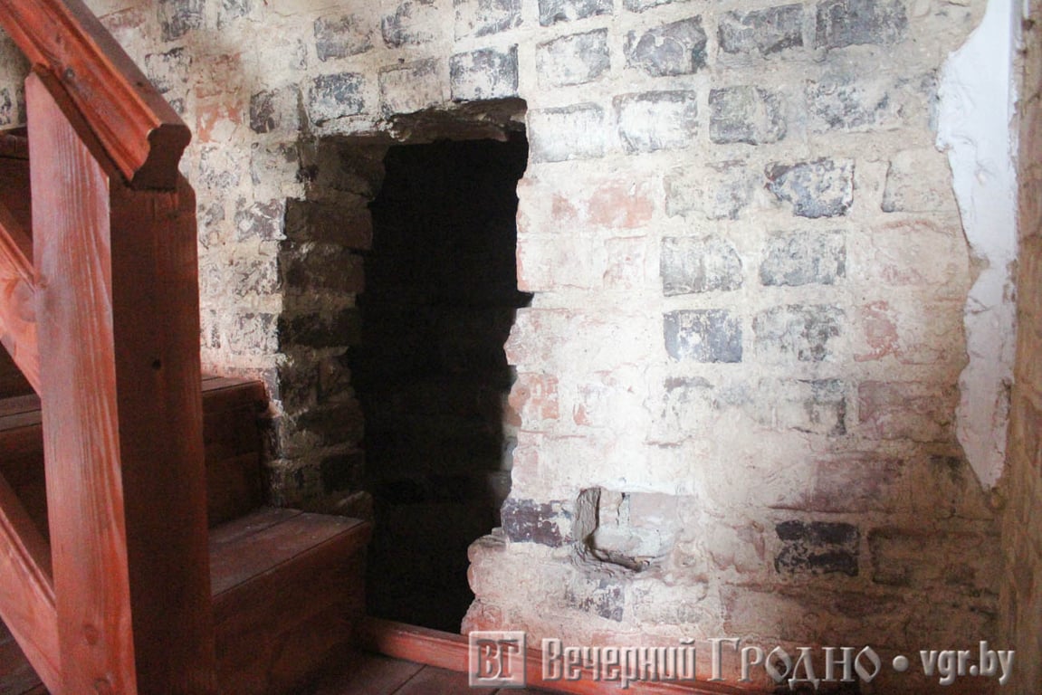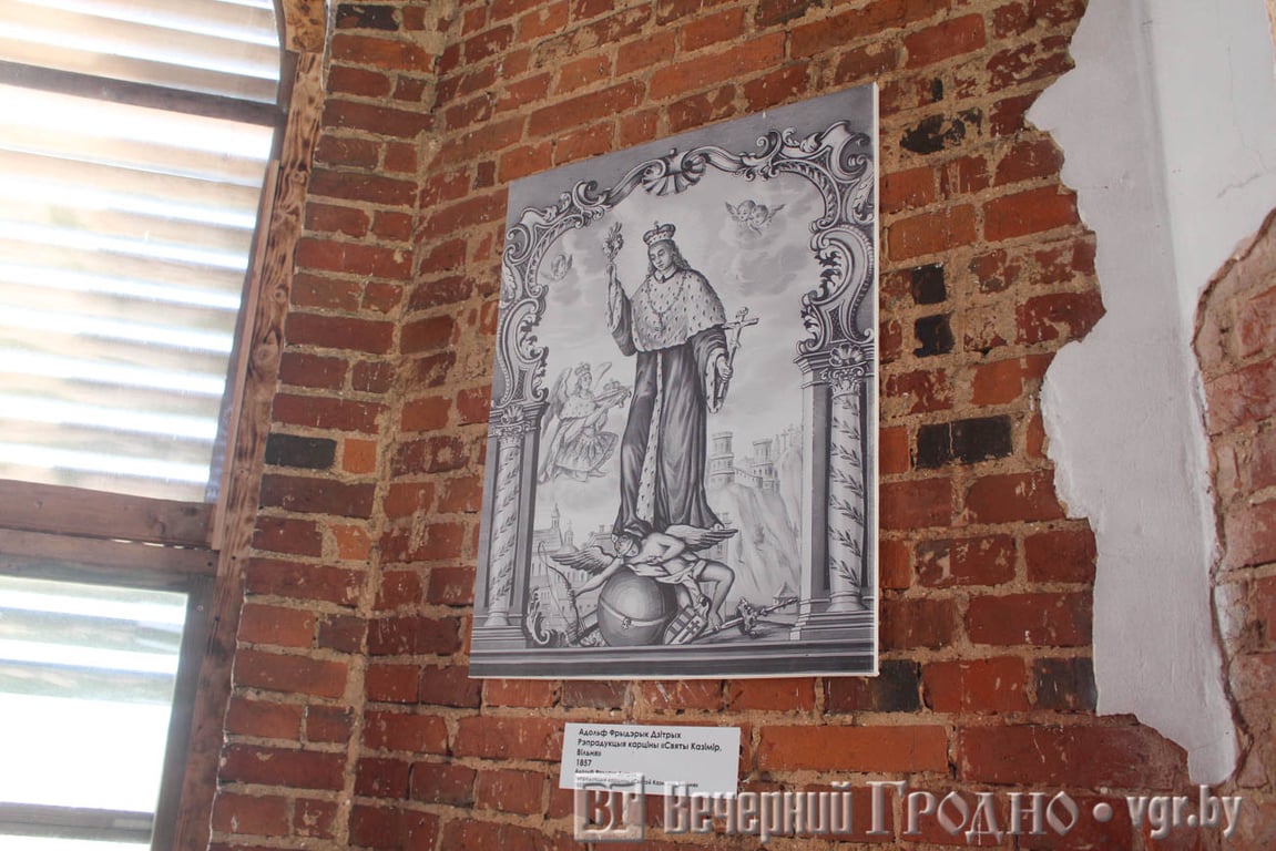В храме есть лестница, состоящая из 89 ступеней. По ней можно подняться на самую высокую башню до смотровой площадки, откуда открывается потрясающий вид на окрестности. По пути вверх повсюду висят изображения святого Казимира, открыта древняя кирпичная кладка, размещены ценные экспонаты. Ощущение, словно идешь по необычному музею. Позже нам рассказал ксендз, что картины создавали с помощью искусственного интеллекта.
