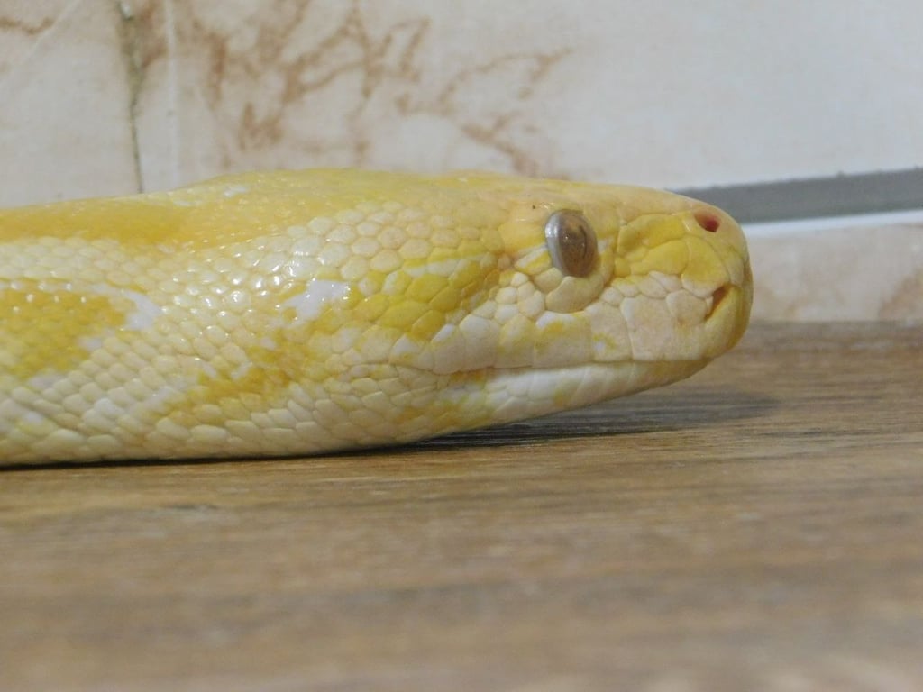 Лютик — питон-альбинос, отсюда его необычная «золотая» окраска. Ему около трех лет, в зоопарке — с 2022 года. Длина питона — пока около двух метров. В соседнем террариуме живет его подруга, тоже тигровый питон, Василиса — она старше Лютика и длиннее, ее «рост» составляет более 5,5 метров!