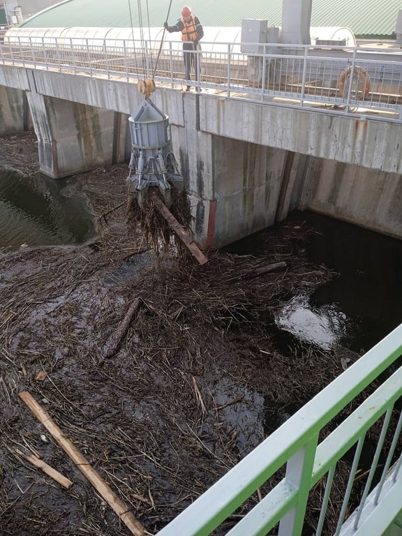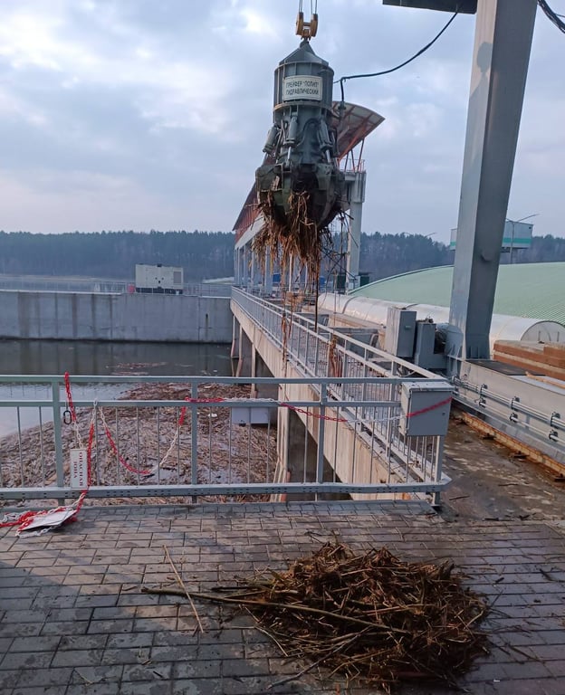На плотине гидроэлектростанции периодически скапливается плавающий мусор: бытовые отходы, пластик, много вода приносит веток и деревьев.