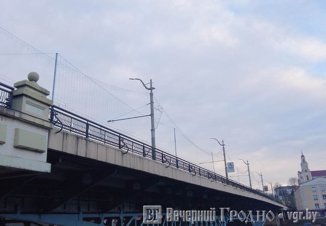 На Старом мосту, с правой стороны (как ехать в сторону Советской площади), установили столбики и вешают гирлянду.