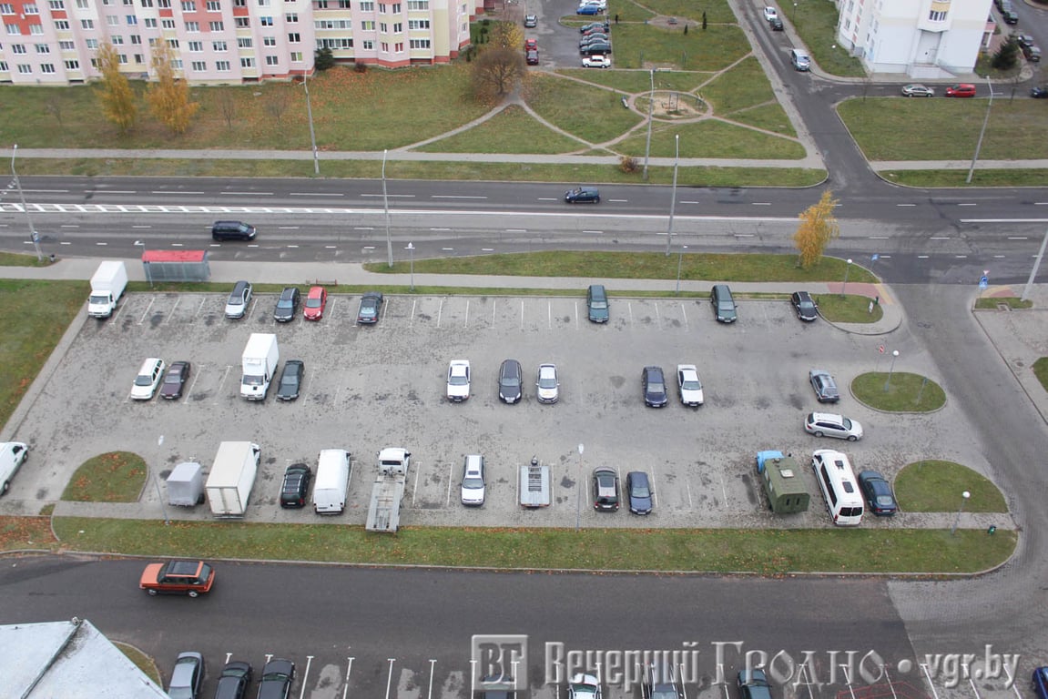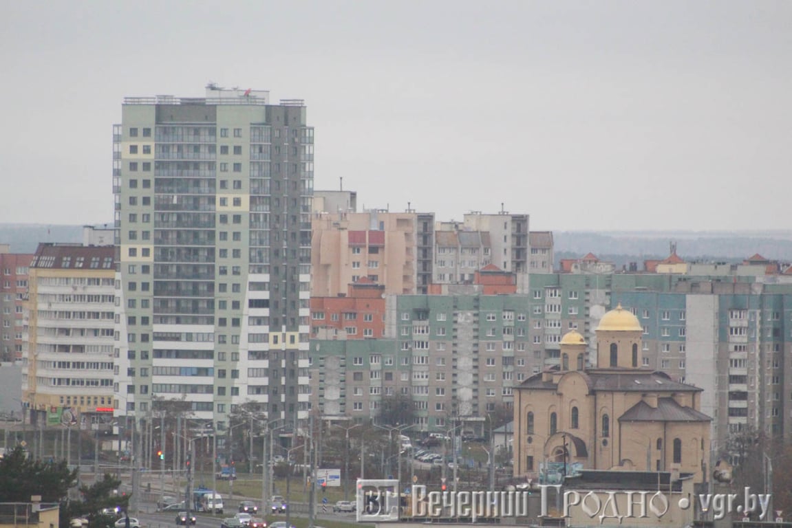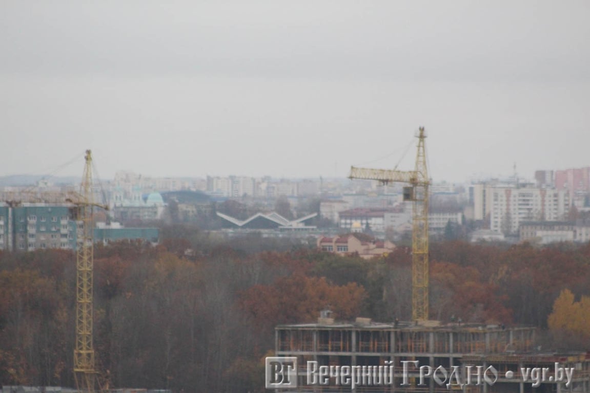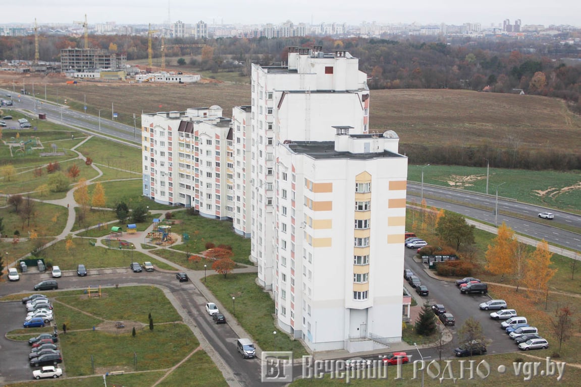 Южная часть города выглядит, как на ладони. Тут и плотная застройка спального района, и «Тринити» с необычного ракурса, и пешеходная дорожка на месте бывшей железной дороги. А если присмотреться, то можно увидеть центр Гродно с рынком и телевышкой.