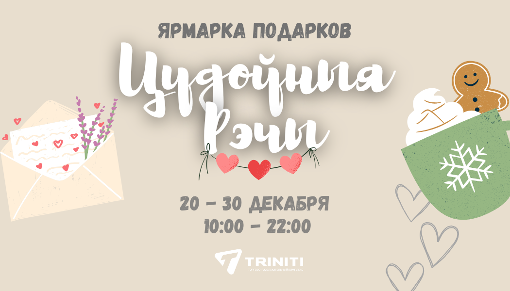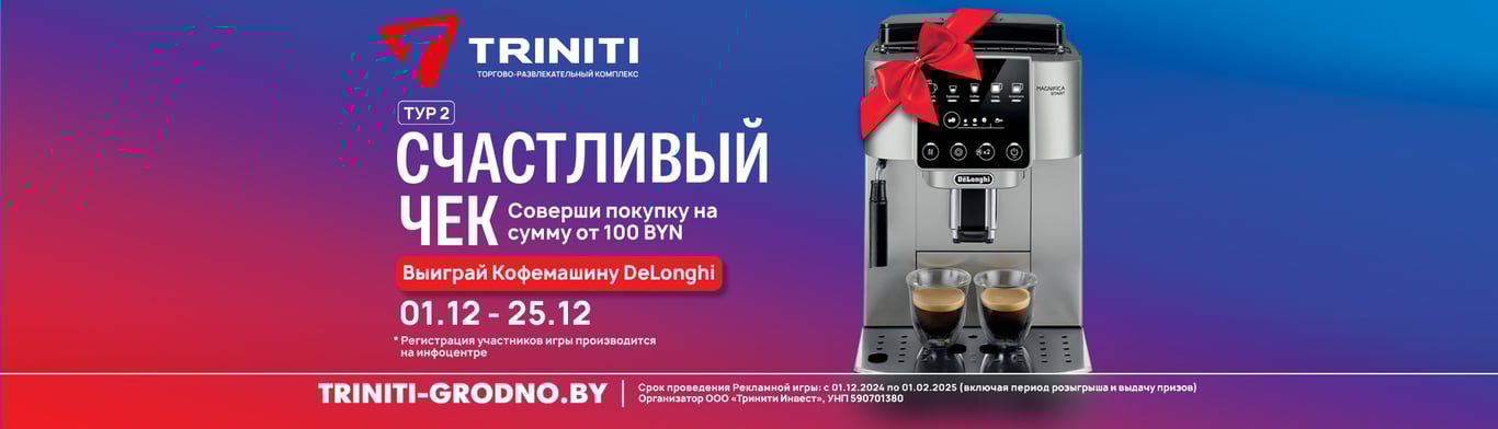 - Совершай покупки в ТРК TRINITI с 1 декабря по 25 декабря 2024 года на сумму от 100 белорусских рублей (одним чеком). Обращаем внимание, что алкогольные и табачные изделия, а также лекарства не учитываются.