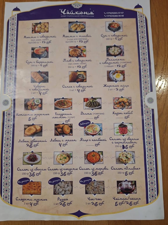 — Мы предлагаем людям заказать готовые блюда на ваш праздничный стол. Для этого нужно позвонить в чайхану и сделать заказ, — говорит Фуркат. — К выбору гостей плов, манты, пельмени, котлеты, салаты, лаваши, а также сладости: чак-чак и другие мучные сладости.