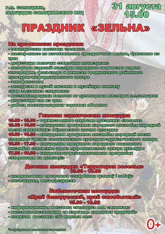 На сцене выступят коллективы любительского творчества Гродненского района. Зрители увидят выставку освященных венков и трав, смогут поучаствовать в мастер-классах по изготовлению венков и букетов из лечебных трав, а также попробовать выпечку и чай от местных кулинарных мастеров.