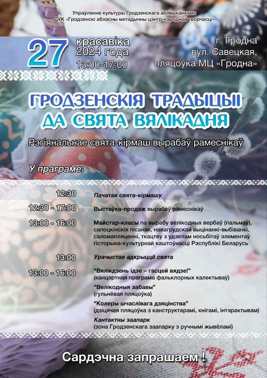 Гости ярмарки смогут поучаствовать в мастер-классах по изготовлению вербочек, сопоцинских писанок, соломоплетении и ткачеству. На сцене выступят фольклорные коллективы, а рядом будет работать контрактный зоопарк и детская площадка.