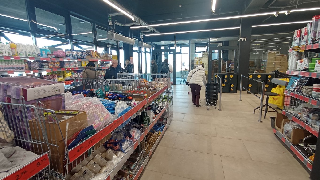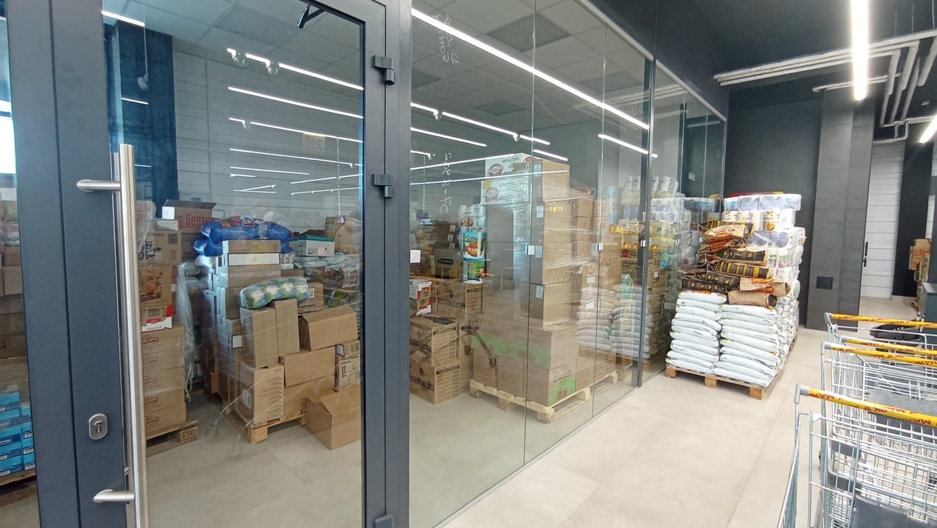 Магазин занял весь первый этаж. Что касается ассортимента, то он ничем не отличается от остальных магазинов этой торговой сети: продукты, товары для дома, товары для домашних питомцев и многое другое.