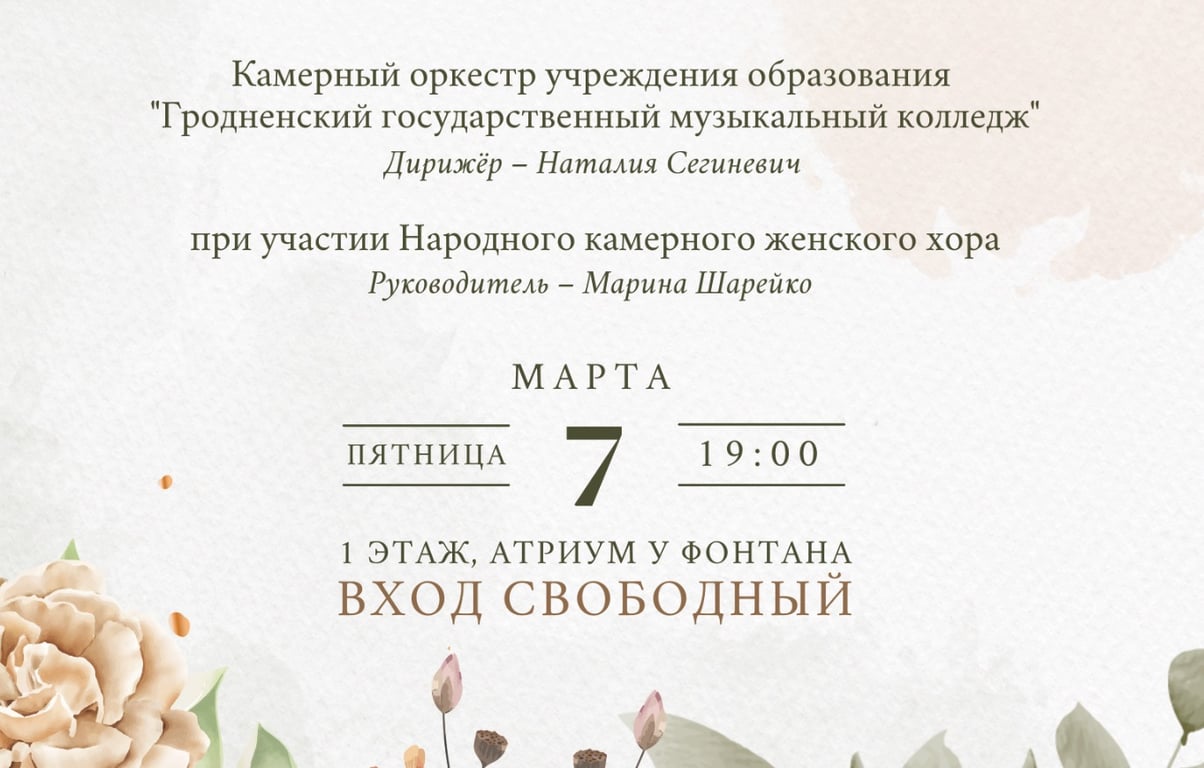 В программе примет участие лауреат республиканских и международных конкурсов Камерный оркестр учреждения образования «Гродненский государственный музыкальный колледж» под руководством дирижёра оркестра Наталии Сегиневич, а также при участии Народного камерного женского хора. Художественный руководитель хора – Марина Шарейко.