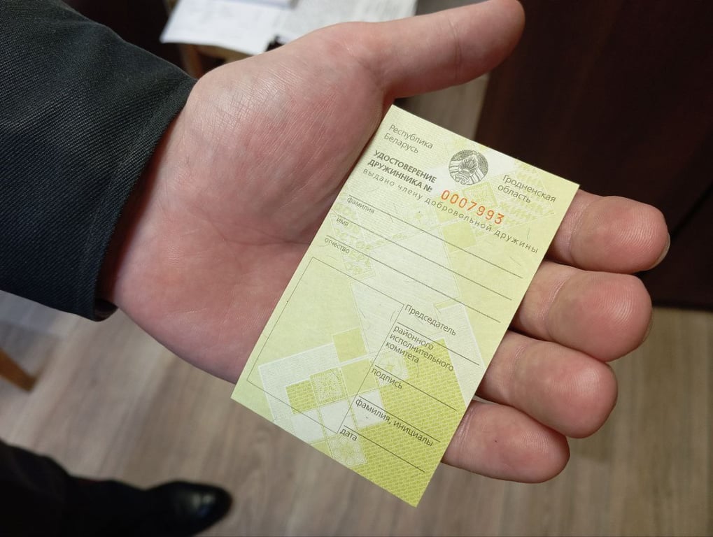 Как и у сотрудника милиции, у дружинника есть соответствующее удостоверение. Оно светло-зеленого цвета, с водяными знаками, на лицевой стороне указаны страна, область, герб РБ, номер документа, фамилия, фото и печать исполкома, на оборотной — подразделение, к которому относится добровольная дружина. Есть один нюанс: на дежурствах такое удостоверение действительно только при наличии паспорта у дружинника.