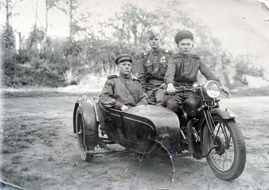 В коляске мотоцикла М-72 гродненец Волочугин, 1945