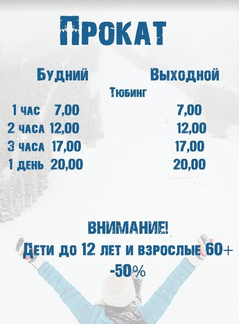 Стоимость входного билета на тюбинговый склон составляет 10 рублей в будний день и 12 рублей в выходной. Детям до 12 лет и людям старше 60 лет скидка 50%.