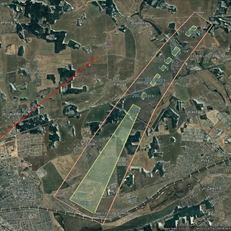 Рассчитана траектория метеора и вероятностное поле выпадения метеоритов. Фрагменты метеорита предположительно выпали по линии деревень Рябый слуп, Присынок, Калюга, Черный лес и Высокие ляды.