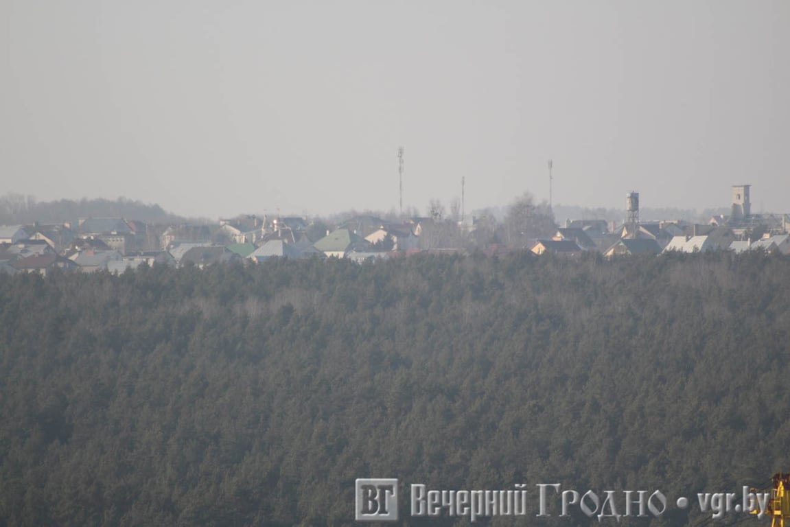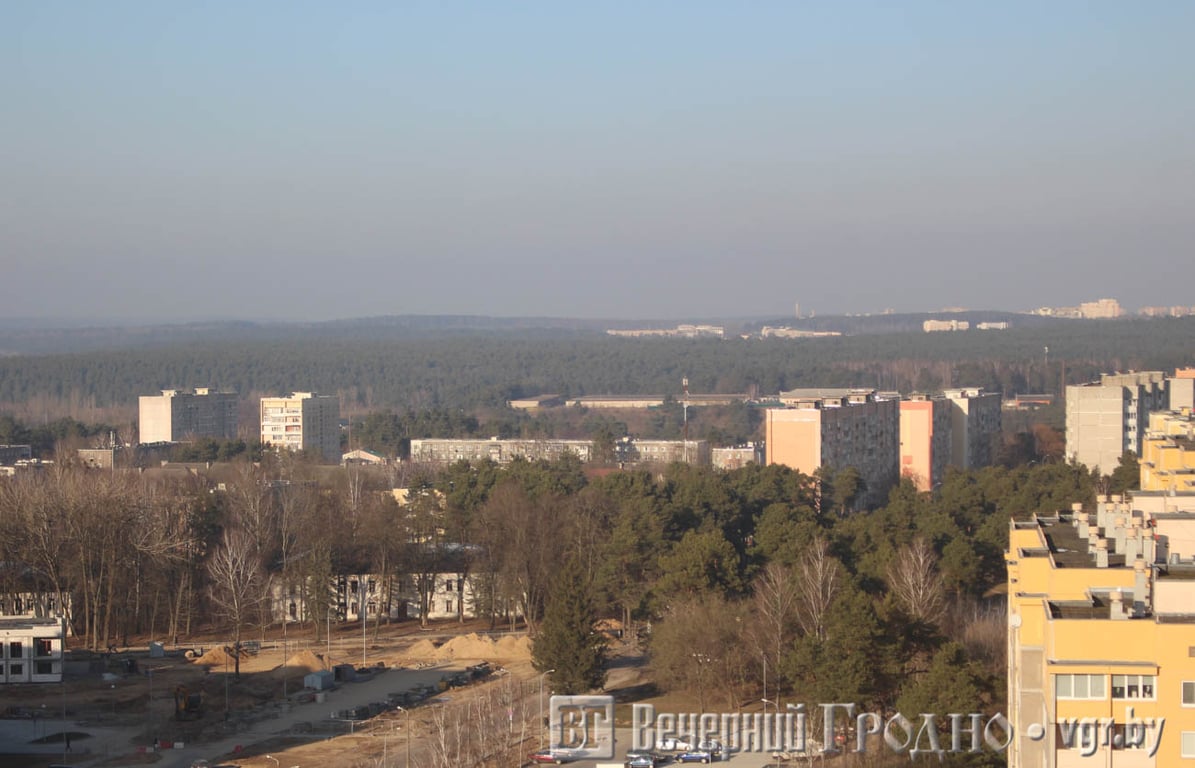 Этот район быстро застраивают на территории бывшей воинской части. Вдалеке лесопарки Лососно и Пышки, за ними областная больница, онкодиспансер и КСМ. Справа в углу дома на Болдина.