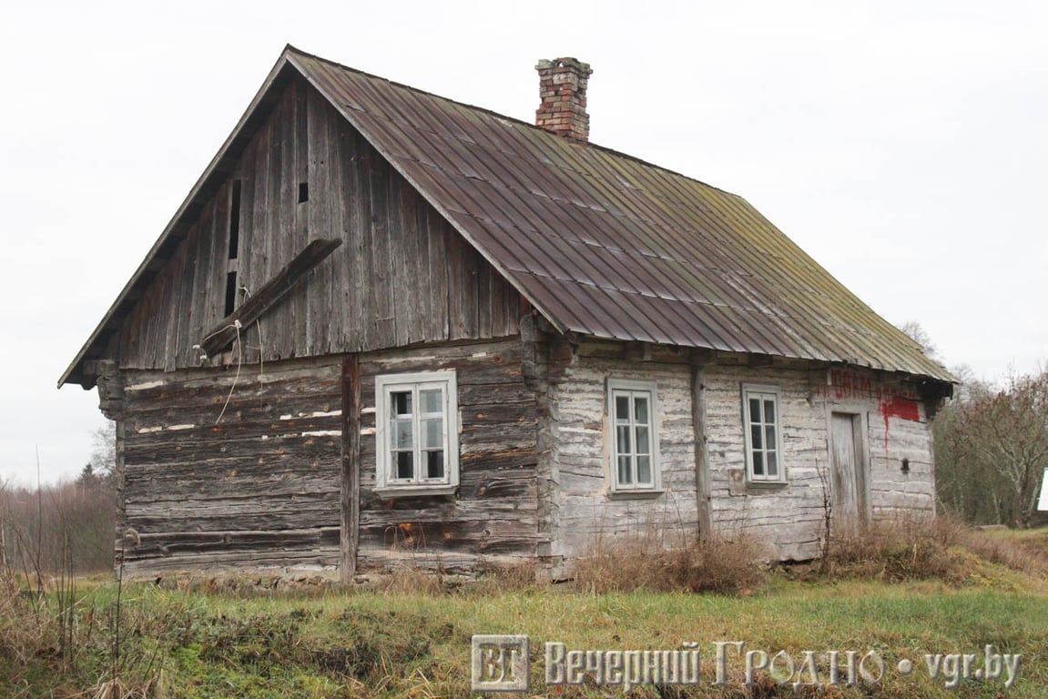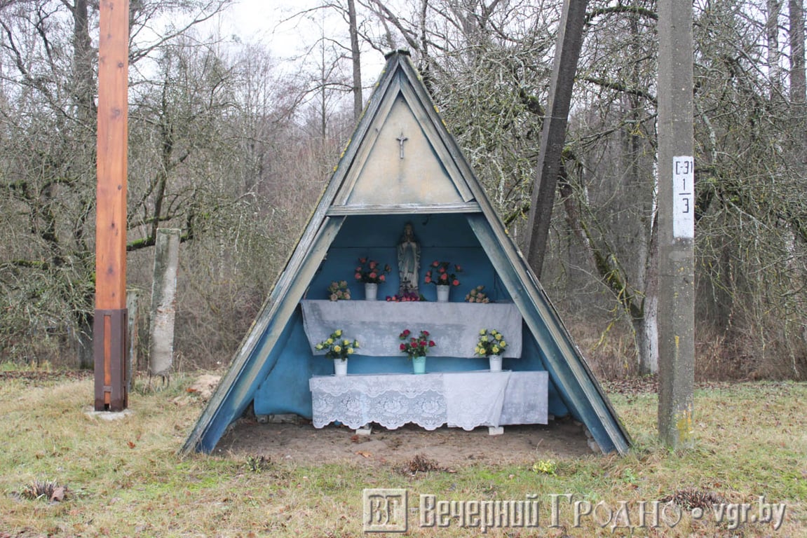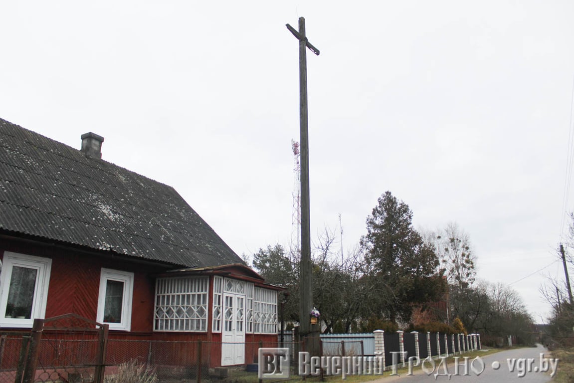 В одном из дворов в небо возвысился старый деревянный крест. Вверху он обветшал, и, кажется, в любой момент может зацепить провода и упасть на землю. Местные говорят, что его поставили первые хозяева дома, у которых в роду был ксендз.