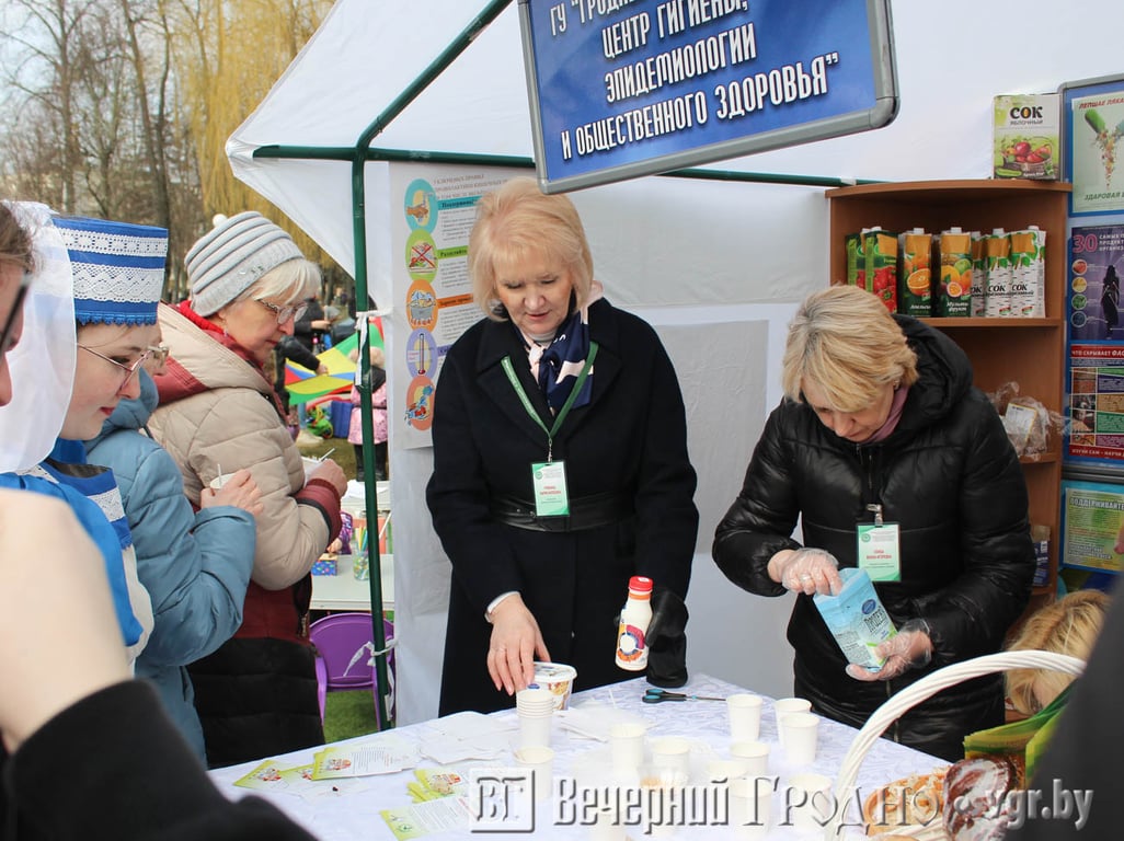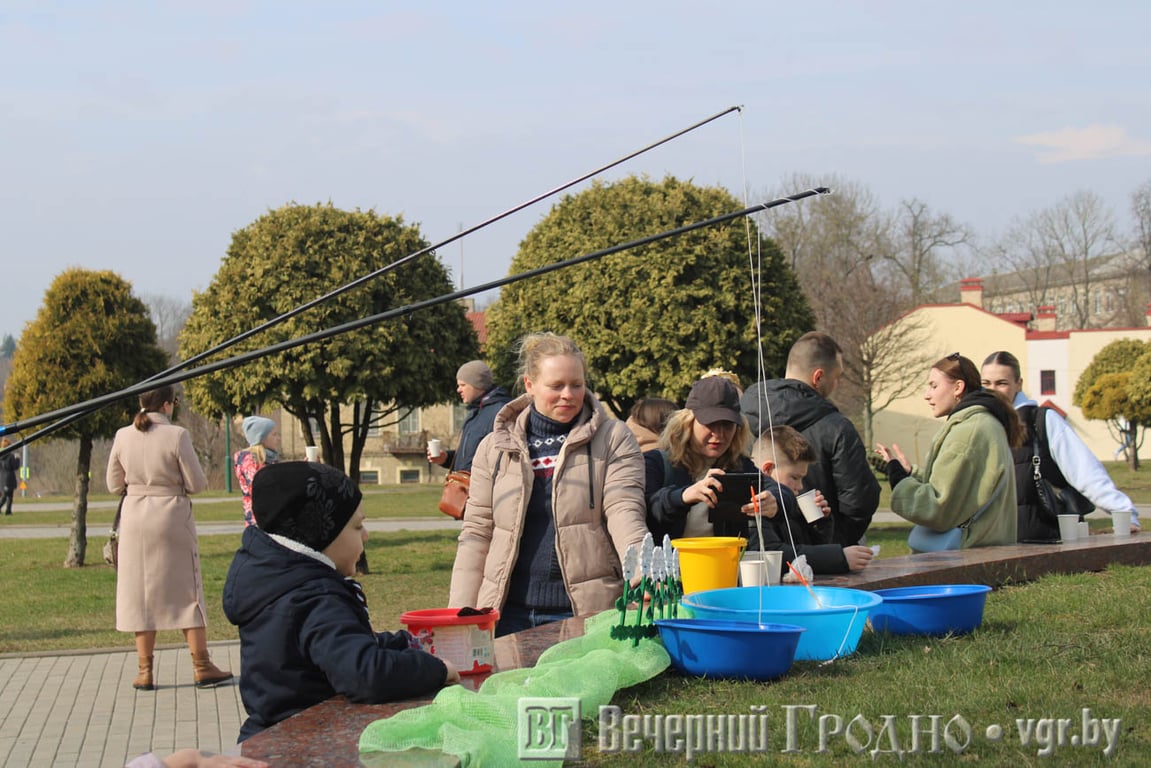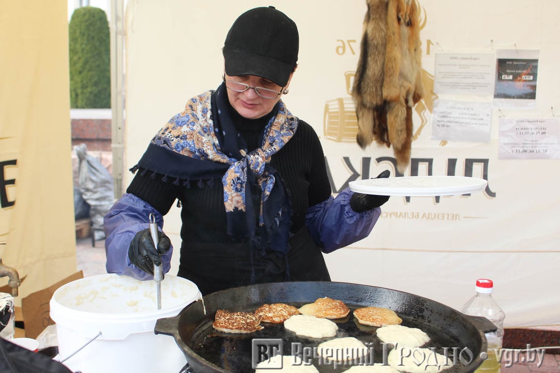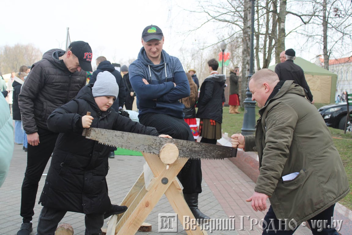 На одной из площадок организовали различные конкурсы. Например, нужно было распилить бревно, поймать рыбку, толкнуть болванчика или устроить на бревне бой подушками. Победители получал вкусный подарок — бесплатный блин и чай. Такой интерактив придумало РУП «Гродноэнерго». На Масленицу предприятие приготовило более 300 блинов.