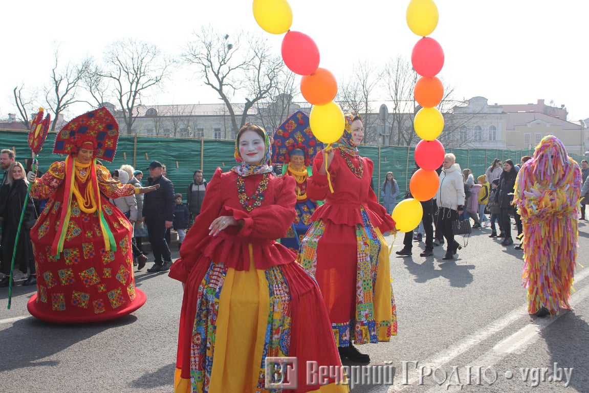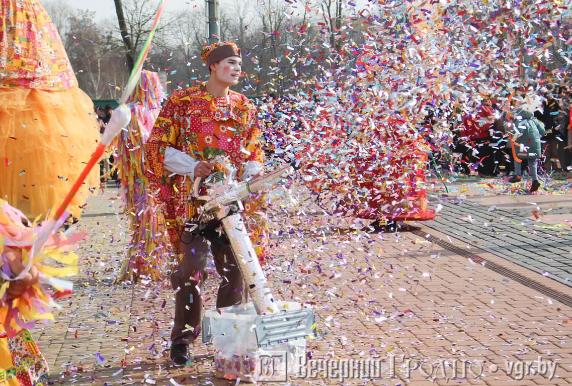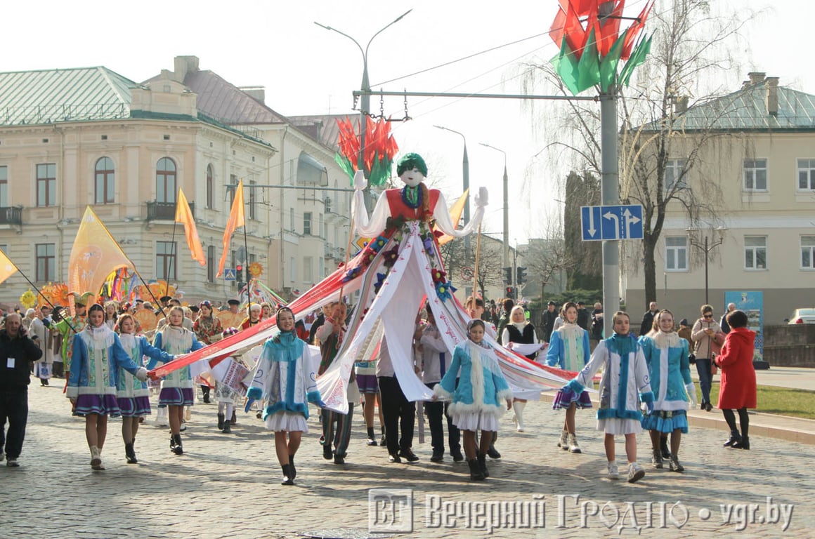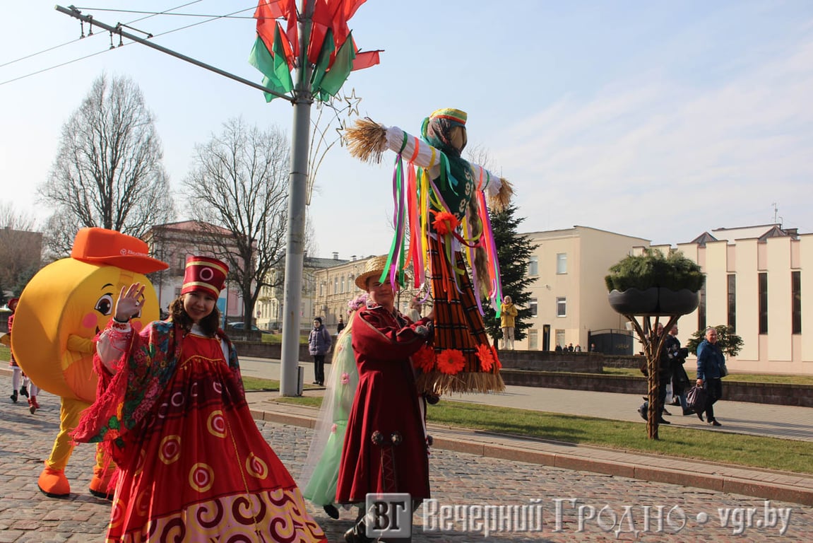 Стартовал праздник с масленичного парада. Чучело пронесли по Социалистической улице в сопровождении ряженых и скоморохов, театра живых скульптур, народных умельцев, представителей гродненских предприятий и организаций и спортсменов.