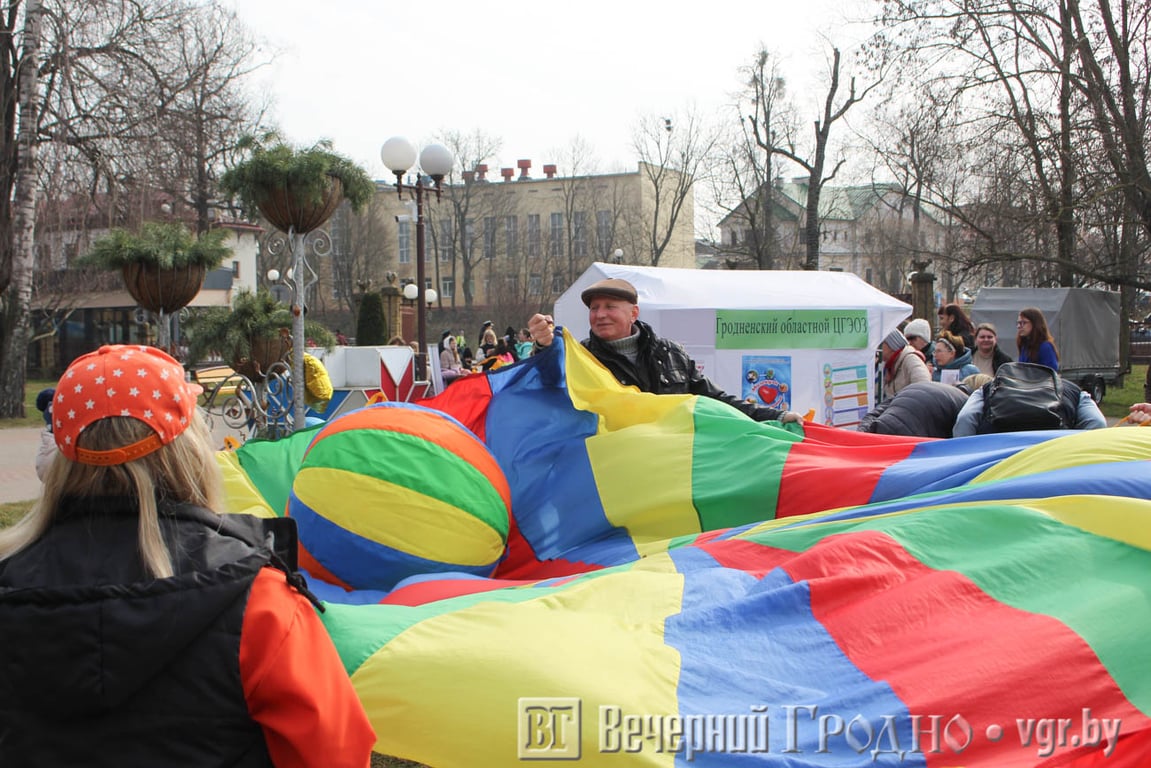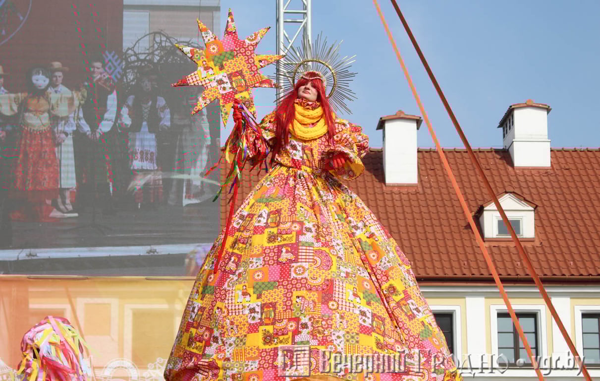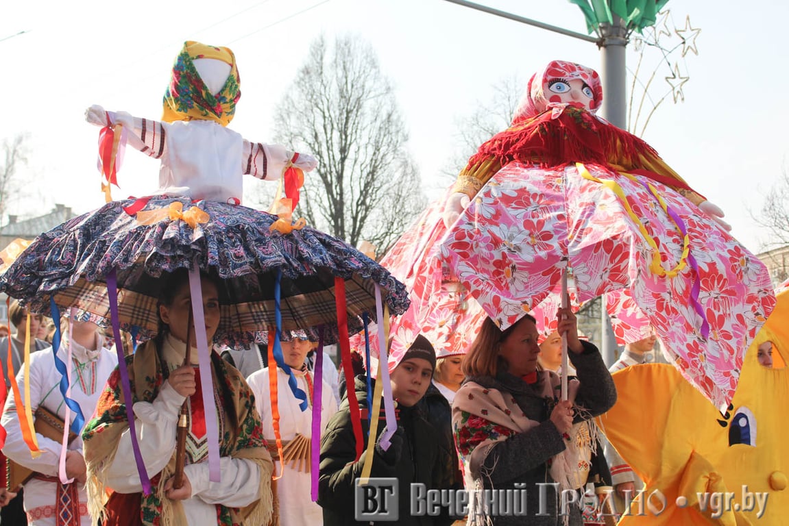 Стартовал праздник с масленичного парада. Чучело пронесли по Социалистической улице в сопровождении ряженых и скоморохов, театра живых скульптур, народных умельцев, представителей гродненских предприятий и организаций и спортсменов.