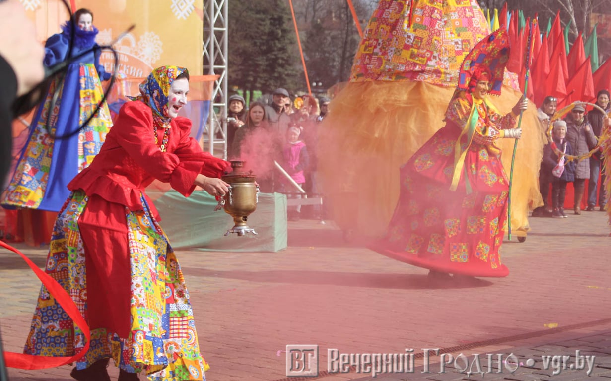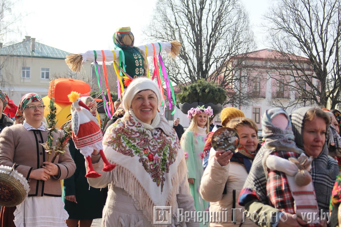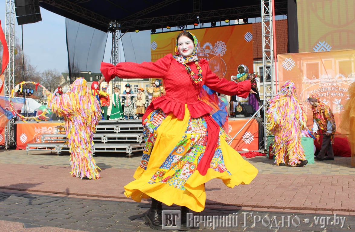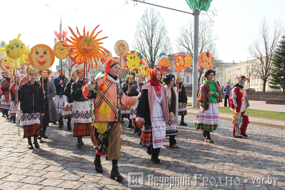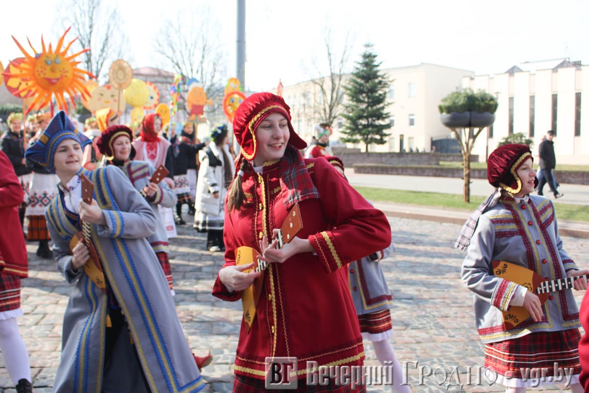 Финишировала колонна на площади Ленина. Здесь же, на главной сцене, устроили театрализованное представление и открыли фестиваль. Завершилась официальная часть программы масленичным хороводом, который собрал несколько десятков гродненцев.
