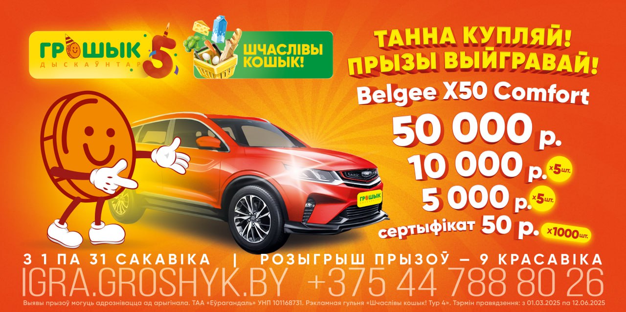 За три тура игры «Шчаслівы кошык!» с мая 2024 года по январь 2025 года было разыграно более 5300 призов на сумму почти 700 000 рублей! И сейчас у каждого покупателя сети дискаунтеров «Грошык» за покупки с 1 по 31 марта есть реальный шанс стать обладателем внушительных денежных призов, сертификатов на покупки или даже выиграть стильный, динамичный и яркий автомобиль BELGEE X50 Comfort!