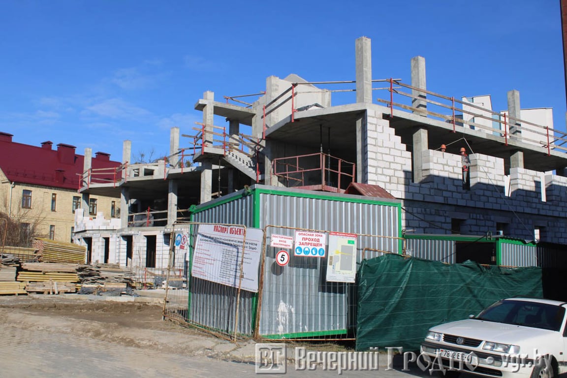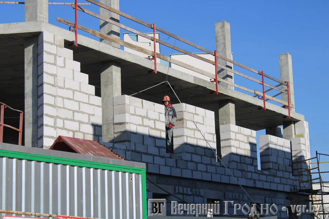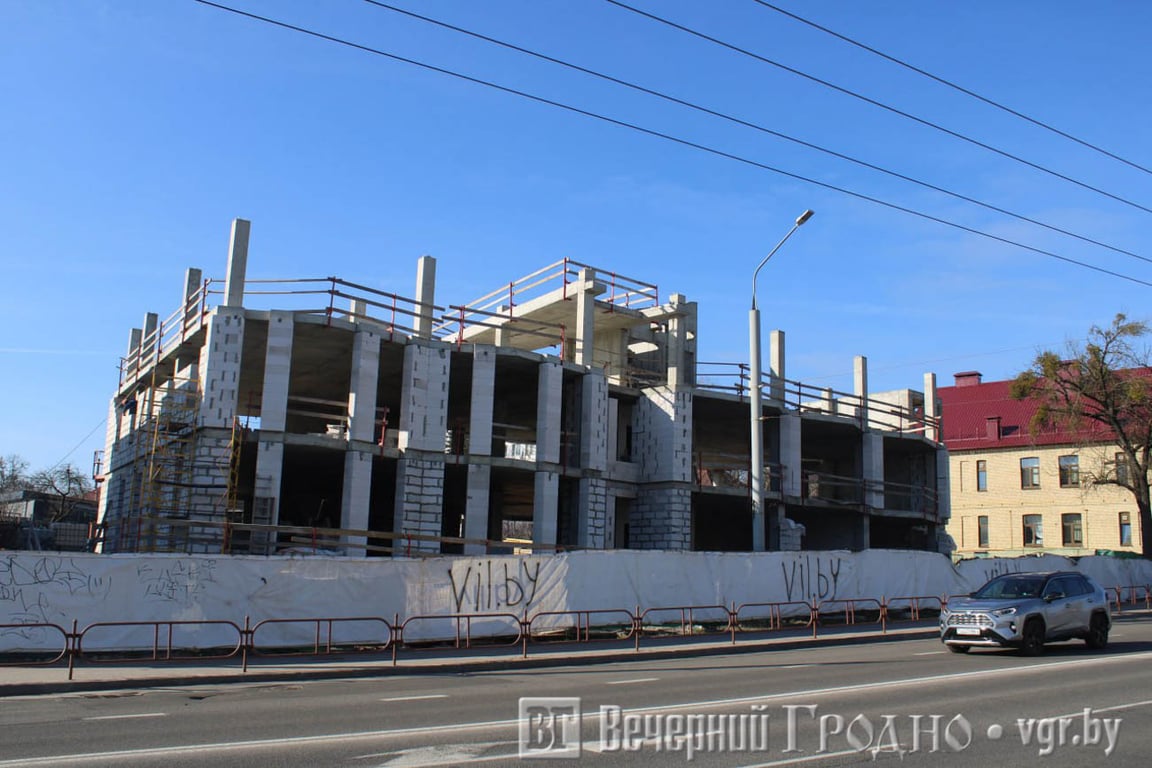 Напомним, работы идут на участке рядом с «Рембыттехникой» между новым торговым центром и интернатом для футболистов школы ФК «Неман». Пока возведены два из трех этажей. Строительная площадка огорожена.