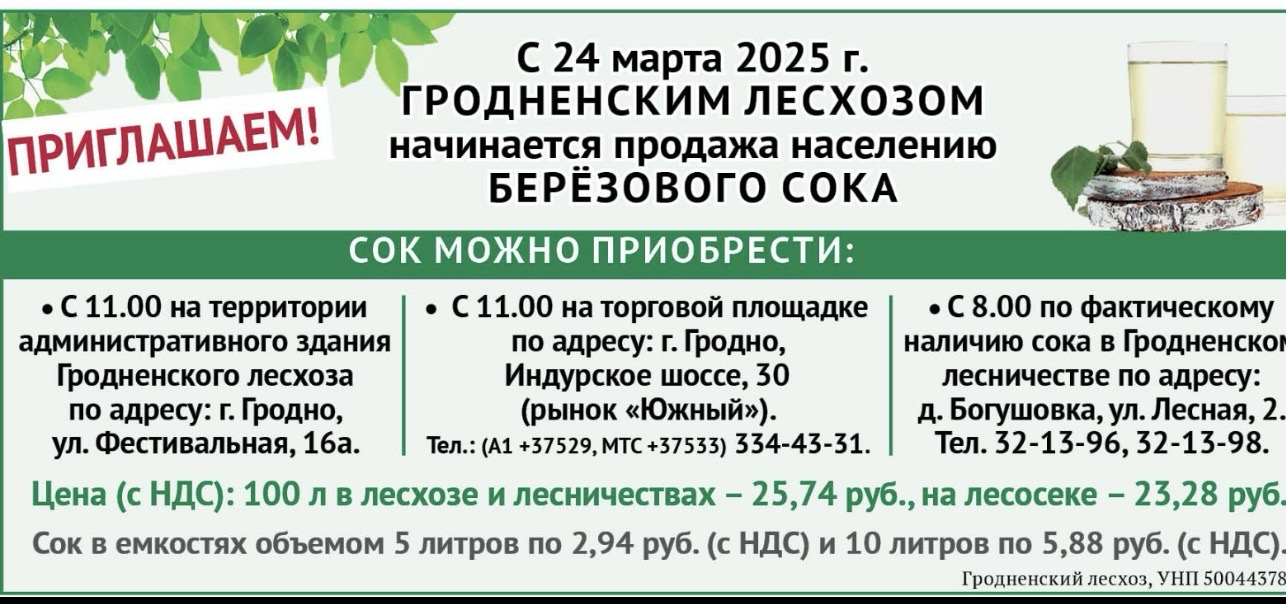 Приобрести березовый сок можно с понедельника, 24 марта. Его будут продавать в Гродно на «Южном» рынке (площадка «Лесной домик»), на Фестивальной на территории лесхоза, а также в Гродненском лесничестве в районе деревни Казимировка.