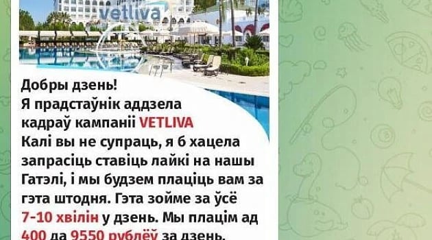 Так, преступники действуют от имени популярного в Беларуси туристического портала vetliva.by. В телеграм людям приходят сообщения с предложением ставить лайки на отели, и за это готовы платить от 20 до 300 рублей в день.