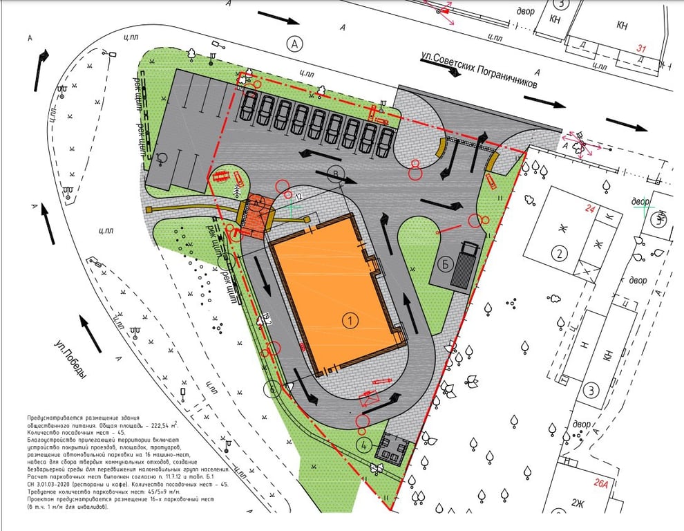 Здание будет одноэтажным, его площадь составит более 222,5 кв. м. Ресторан рассчитан на 45 посадочных мест. Территорию вокруг благоустроят. Рядом сделают парковку на 16 мест, включая одно место для инвалидов.
