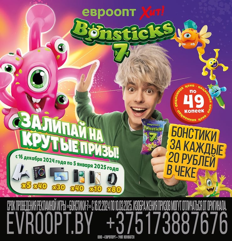 Следите за акцией, собирайте Бонстиков и выигрывайте крутые призы! Подробности на сайте bonsticks.evroopt.by и в официальных соцсетях «Евроопт».