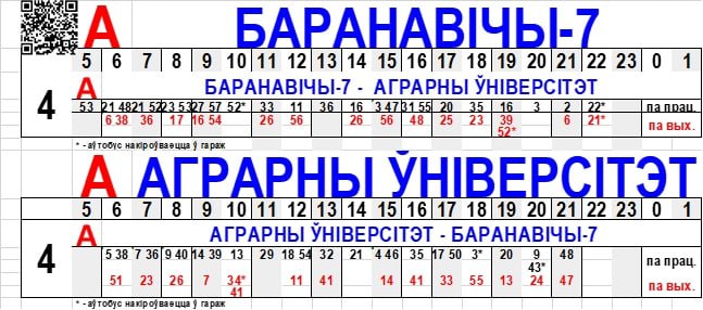 Так, меняется график движения автобуса №4 «Барановичи-7 — Аграрный университет» по рабочим дням.