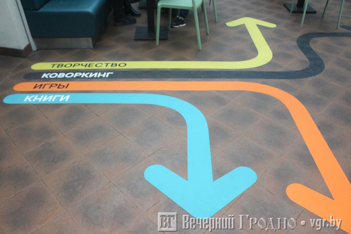 Вход на площадку свободный, рядом работают гардероб и кофейня со свежей выпечкой.