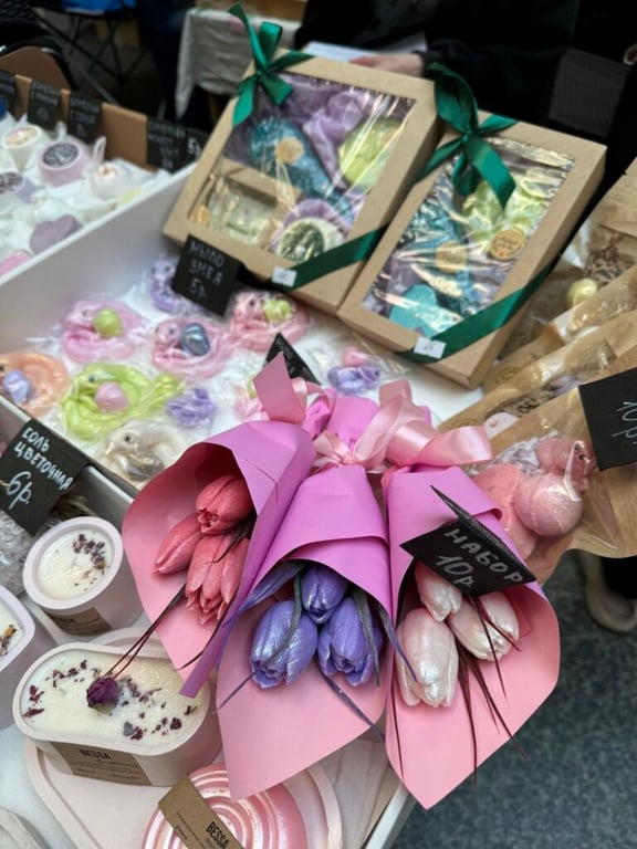 Не останутся без внимания и любители оригинальных подарков: здесь можно будет найти мыло и свечи ручной работы, кондитерские изделия ручной работы, вязаные игрушки, косметику, бижутерию, а также изделия из дерева, кожи и гипса. Конечно же, не обойдется и без цветочных композиций, которые добавят ярких красок в этот зимний период.