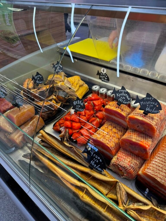 На ярмарке можно прибрести рыбные деликатесы. В ассортименте – натуральная копченая рыба, крафтовые рулеты и свежая икра.