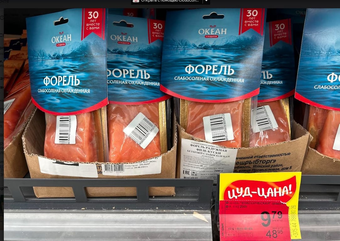 Набор из замороженного лосося стоит 11,99 рубля за кг, королевские креветки – 20,89 за кг, а слабосоленая форель – 9,79 за 200 г.
