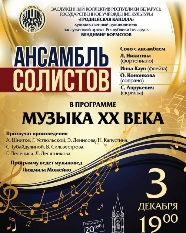 В 19 часов здесь начнется концерт «Музыка ХХ века». В программе вы услышите музыкальную классику ХХ века. Артисты под управлением дирижера, Заслуженного артиста Беларуси Владимира Бормотова, исполнят произведения Шнитке, Денисова, Десятникова, Капустина, Сильвестрова и других авторов.