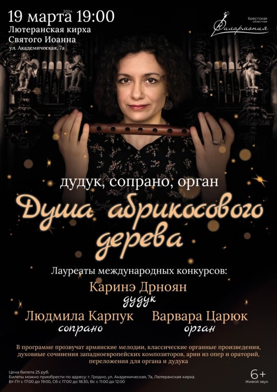 19 марта состоится заключительный концерт Лютеранской церкви. «Душа абрикосового дерева» – это гармония и красота, которую излучают шедевры Баха, Шуберта, в армянских мелодиях Комитаса, Хачатур Аветисяна, Нерсес Шнорали слышится глухой рокот древности и нежность цветов абрикосового дерева, из которого традиционно делают дудук в Армении.