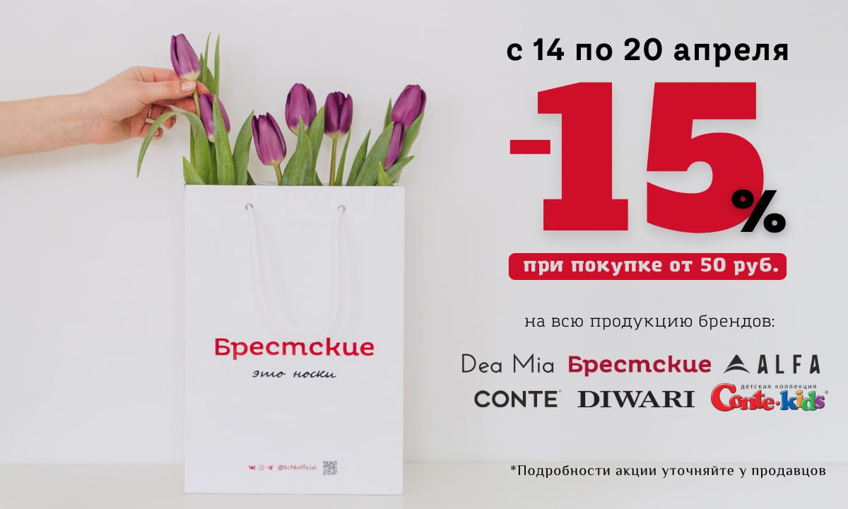 С 14 по 20 апреля — выгодная акция для всех покупателей. При покупке от 50 рублей — скидка 15% на всю продукцию. В ассортименте магазина носочно-чулочные изделия, одежда для дома, нижнее бельё и детские товары от популярных брендов: «Брестские», ALFA, Dea Mia, CONTE, Diwari, Conte Kids.