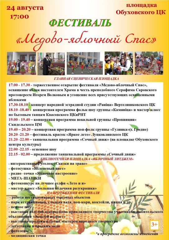 Для гостей подготовят ярмарку меда с дегустацией продукта. На сцене будут выступать артисты Гродно и района. Дети развлекутся на игровых площадках и на фестивале красок. Кроме того, на празднике можно будет освятить яблоки и увидеть огненное шоу.