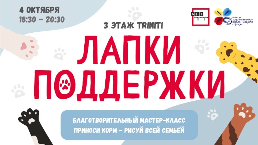 - Принесите корм для животных и получите бесплатное участие в мастер-классе по рисованию: 4 октября, пятница, с 18:30 до 20:30 в творческом пространстве на 3 этаже ТРК TRINITI, напротив магазинов Офистон-маркет, OZ.by, VDOM. Вместе с профессиональными художниками вы сможете создать уникальные рисунки, посвящённые домашним питомцам.