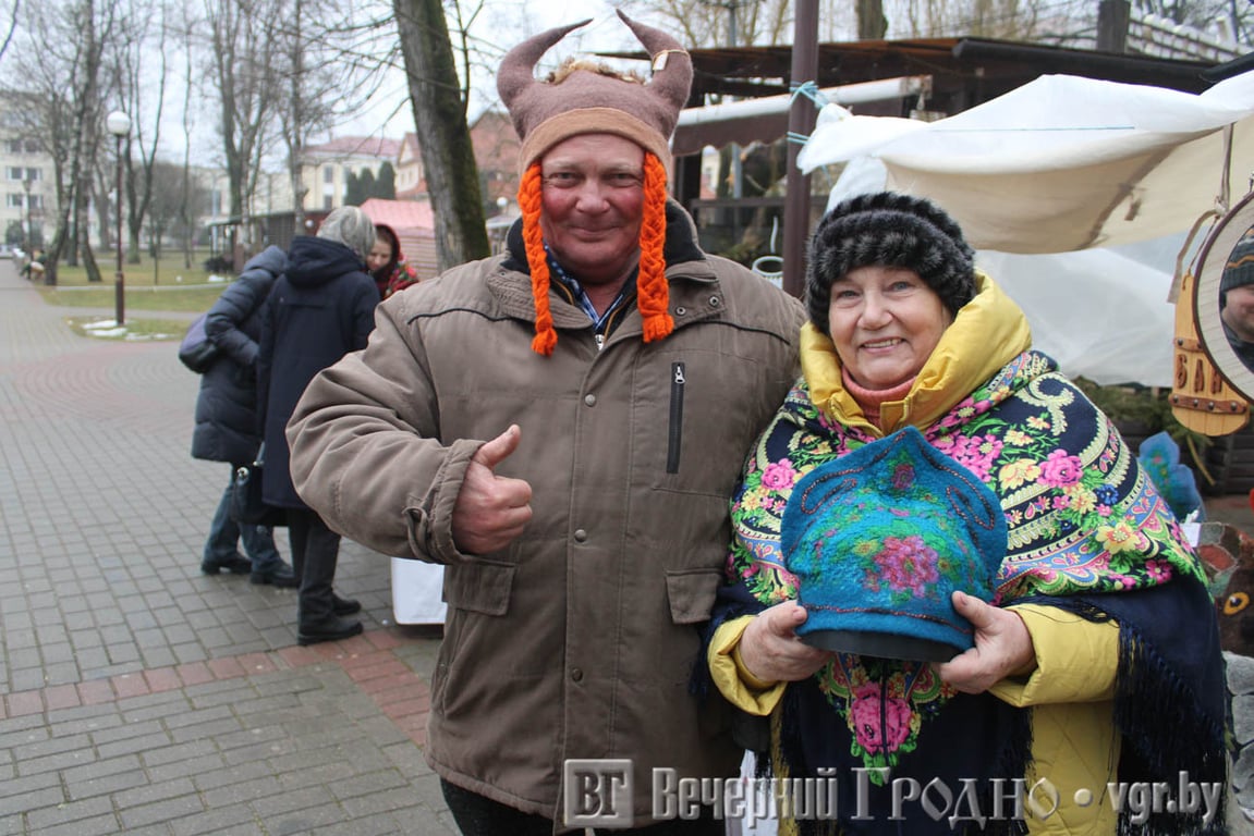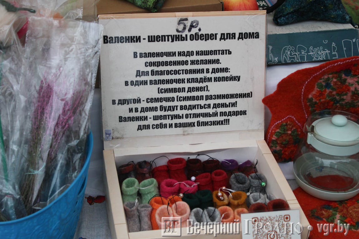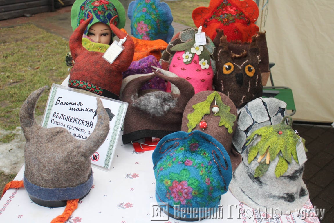 Эдуард и Галина привезли из Пинска валенки-обереги и войлочные шапки для бани. Мужчина говорит, что в Беларуси мало мастеров, которые делают такие шапки. Дело в том, что материал закупают за границей, да и сам процесс занимает около трех дней.