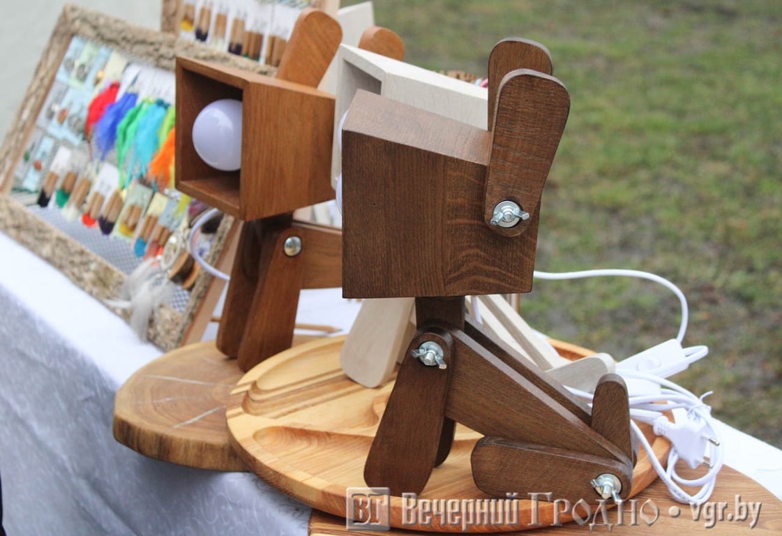 А Татьяна из Гродно продавала настольные лампы в форме собачек. Стоит такой необычный фонарь 100 рублей. Детали из дуба скреплены так, что у собачки двигаются лапки, лампу можно поставить, как угодно.