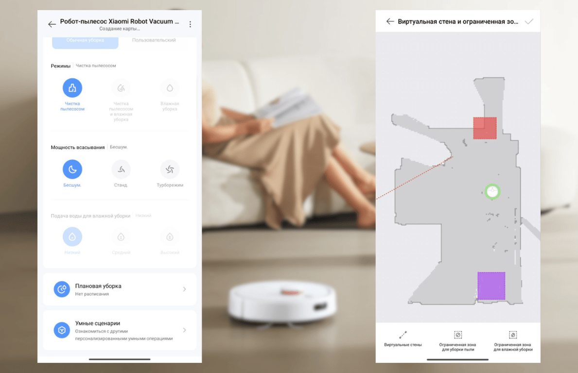 Теперь переходим к уборке с Vacuum S20 Plus. Можно настроить собственный режим или выбрать из четырёх: сухая уборка, влажная, комплексная и даже уборка пыли перед влажной.Настройки всасывания тоже на выбор: бесшумная, стандартная, интенсивная и турбо.