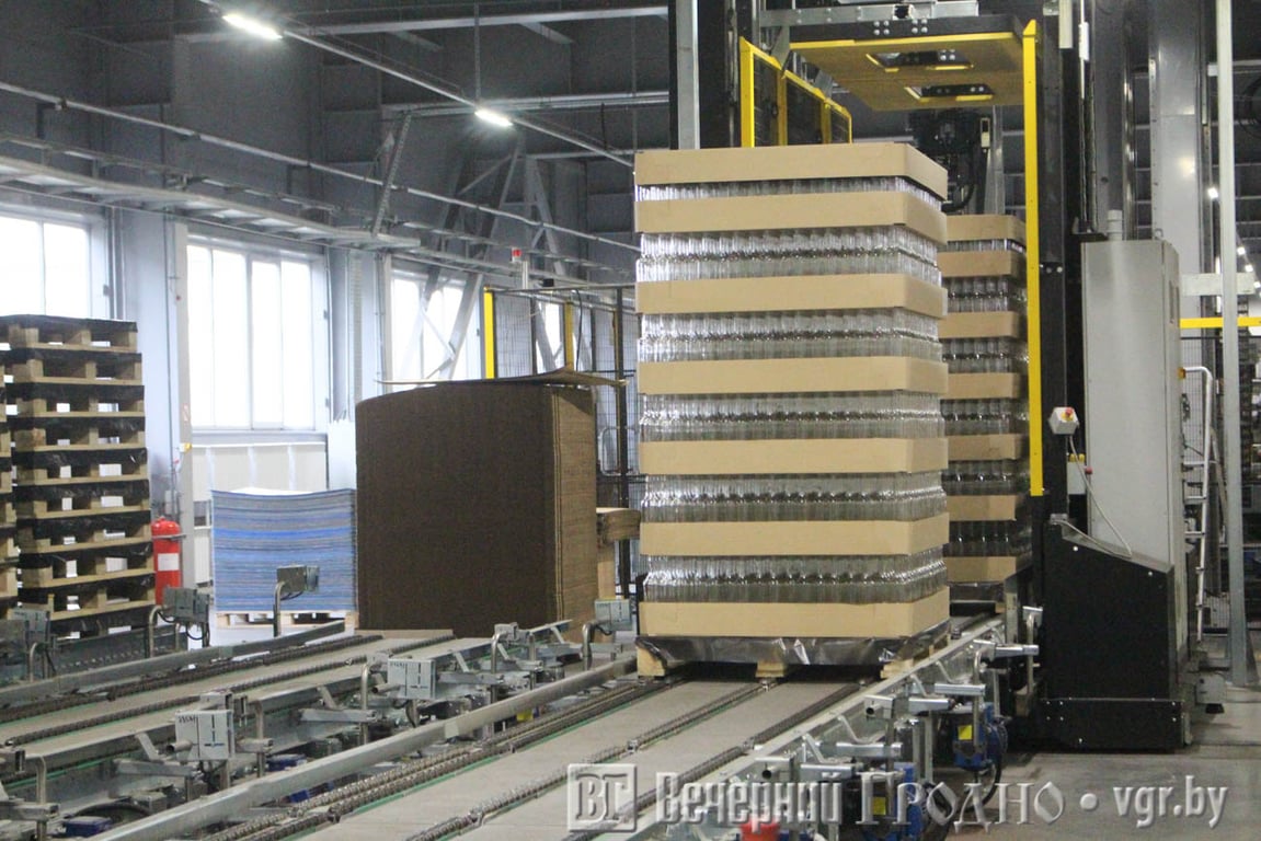 После всех проверок тару отправляют на упаковку. Там тоже весь процесс автоматизирован. Машины-роботы сами складывают готовую тару с линий и накопительных столов в палеты, перемещают их на упаковку, а затем на склад.